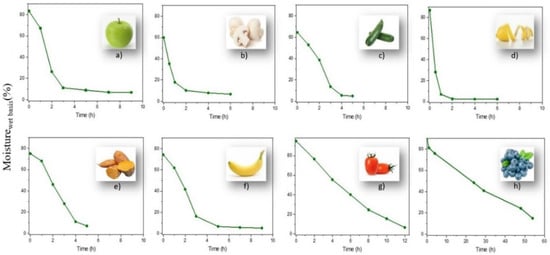 Drying curves (wet basis) of (a) apples, (b) mushrooms, (c) zucchinis, (d) lemon peel, (e) sweet potatoes, (f) bananas, (g) tomatoes, (h) blueberries.