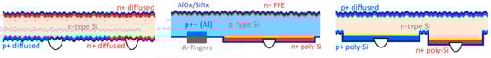 Table 1 summarises the most prominent IBC solar cell concepts in R&D and in the PV market. On the far left, there are three solar cell concepts without any passivating contact from SPIC/ISC, ipv Stuttgart and Jolywood. The ZEBRA IBC cell reaches 24% in production [6,7] and is about 80% based on standard PERC production, using the same equipment. The ipv concept MESA is based on selective laser-diffusions results, of 23.3% [8,9]. There is not much known about the IBC process from Jolywood—only that it is also not based on carrier-selective contact technology and that the P-diffusion is done by implantation. The costs of all three concepts are below 1.5 × PERC costs, which are shown the COO section for the case of ZEBRA. The POLO IBC technology by ISFH is using one carrier-selective contact and also still Al screen printing for the BSF formation. The efficiency for large area devices is at 21.8% [10], and the projected costs in production are also close to PERC. The IBC technologies with both passivating contacts currently have the highest efficiency and the highest costs, which makes them only attractive for high power-density markets such as rooftops.