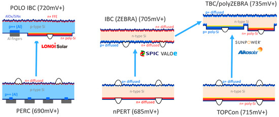 Different structures of IBC solar cells as evolutions from different both-sided contacted solar cells.