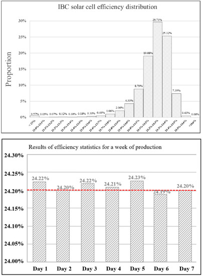 Since 2020, the company SPIC Solar in Xining, China, has been producing ZEBRA solar cells with a capacity of 200 MW annually. The efficiency has been steadily increased, and the silver consumption has been reduced over the last 2 years. Figure 6 shows the parameters from a weekly cell production in April 2022 for the whole distribution and as a daily average. These solar cells were produced on M6 substrates (166 × 166 mm2 with a diagonal of 223 mm2) with an initial thickness of 170 µm using six-busbar technology.