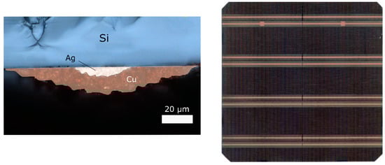 Figure 7 shows, on the left side, the cross-section of a silver and copper screen-printed finger and, on the right side, the backside of the entire M6 ZEBRA solar cell in the four-busbar configuration. The special feature is that only 40 mg silver was printed for the entire solar cell (<5 mg silver/Wp)—which is about half the silver metallisation of PERC. The cell parameters are summarised in Table 3, and, in the experiment, they correspond to the parameters of the reference cell that was only metallised with silver, except for the fill factor, which could be improved.