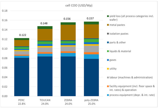 In the present section, we present the results of calculations performed using a bottom-up cost model developed at ISC Konstanz [16], based on the process flows currently implemented in industry for PERC, TOUCAN (ISC’s TOPCon route) and ZEBRA as well as on the anticipated process flow for poly-ZEBRA. The cost structure—i.e., the assumptions for the cost of labour, energy, building, facilities and raw materials—corresponds to the scenario of an integrated cell and module factory located in a low-cost Asian country with a yearly manufacturing capacity of 5 GWp. The wafer cost has been determined based on a poly-silicon cost of USD 15/kg. This is assumed to be the market price in a situation where the supply and the demand of poly-silicon are balanced. The resulting wafer cost is USD 0.61/wafer for p-type Cz-Si M10 (182 mm × 182 mm) wafers and USD 0.664/wafer for n-type Cz-Si M10 wafers. The cost of the Ag-pastes has been calculated for a cost of pure Ag of USD 700/kg. The resulting cost of ownership (COO) for the manufacturing of the different cell technologies is shown in Figure 12.