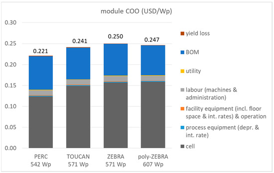 COO of different module technologies and Pmpp (Wp) at STC for a 144 half-cell module using the respective cell technologies.