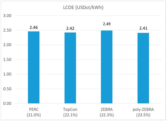 The above calculated results in terms of module power for 144 half-cell (M10) modules, with the respective cell technologies as well as the respective module cost (USD/Wp), have been used as input for calculating the levelised cost of electricity (LCOE) for a fixed-tilt, ground-mounted, utility-scale PV system located in Malaga (Spain). The main assumptions used for the LCOE calculations are summarised in Table 5 and Table 6. The results of the LCOE calculations based on these assumptions are shown in Figure 14.