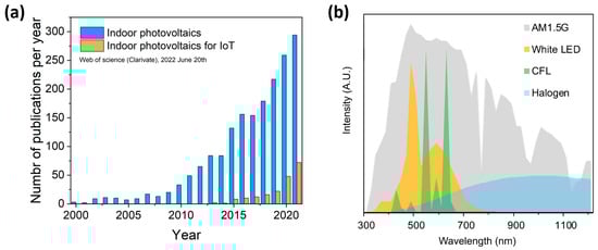 (a) Recent bibliography on indoor photovoltaics and on indoor photovoltaics claiming applications for IoT. Data extracted from Web of Science (Clarivate) in July 2022; (b) Normalized irradiance of light sources including standard solar spectrum (AM1.5G), white LED, compact fluorescent lamps (CFL), and halogen source. Reprinted from reference [31], with permission from Elsevier.