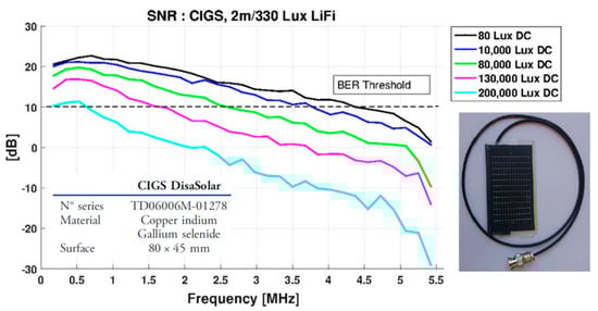 Coming back to the solar panel receivers, in 2016, a joint team between CEA/LETI and SunPartner Technologies investigated the frequency response of thin film PV modules (CIGS from Disasolar and semi-transparent a-Si from SunPartner Technologies) as a function of illumination conditions between 200 and 300,000 Lux provided by an LED [80]. A drastic reduction in DCO-OFDM signal-to-noise ratio (SNR) is evidenced when ambient light noise is rising, especially for the CIGS module, which shows saturation effects (see Figure 4).