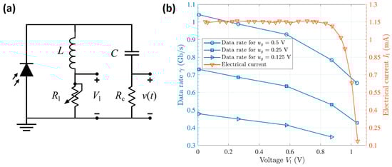 (a) Electrical circuit of the GaAs PV-based receiver used in reference [84]. (b) Corresponding data rate and DC current as a function of load voltage for an OFDM-based transmission with adaptative bit and power loading. Reproduced with permission from reference [84].
