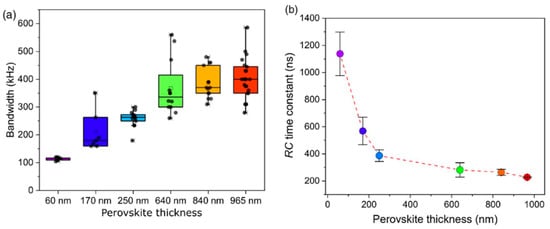 (a) Obtained bandwidth in function of perovskite thickness; (b) Measured constant for solar cells with different perovskite thickness. Reproduced with permission from [107].
