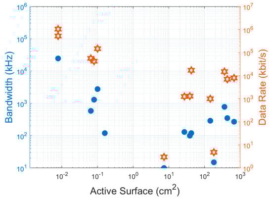 Measured bandwidth and data rate for PV devices with different active surfaces. Data obtained from references [61,62,64,71,75,78,83,84,85,87,91,99,100,107,109].