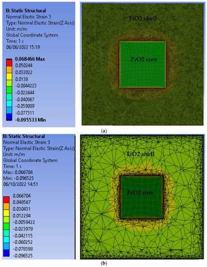 Finite element analysis results of c-axis strains in the midplane normal to the (001) direction of decahedral ZrO2@TiO2 nanoparticles with a 12 nm ZrO2 core and (a) a 10 nm TiO2 shell; (b) a 12 nm TiO2 shell.