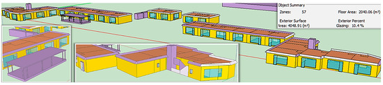 Consistently, with the data acquired during the site investigation, the district has been modeled in TRNSYS 18 environment and the 3D model made in SketchUp is shown in Figure 2. The 3D model contains a total of 57 thermal zones, one for each building space, and the shading elements against solar radiation have been introduced as shading generating elements. Part of the TRNSYS model in the Simulation Studio graphical environment is shown in Figure 3.