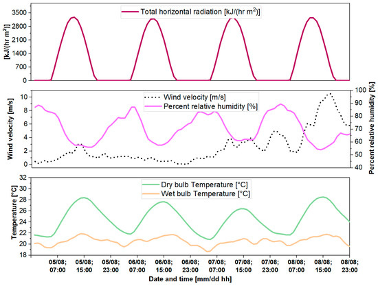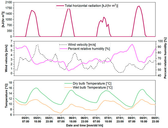 The climate of Licata is characterized by temperate winters and hot summers. Figure 4 and Figure 5 describe the trend of the main climatic variables—total radiation, wind velocity, relative and external temperature (dry bulb and wet bulb temperature)—for some days in the winter period and in the summer period, for example.