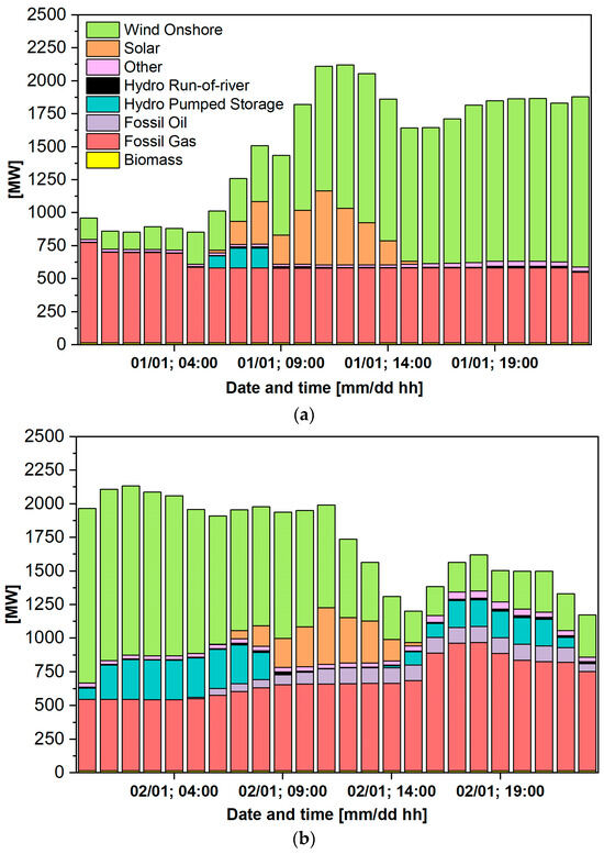 Composition of the regional electricity mix and the distribution for each energy source of the total amount of electricity fed into the grid for each hour of the day. Example for the 1st (a) and 2nd (b) of January.