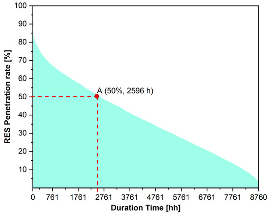 A generic point “i” on the duration curve is characterized by an ordinate value, along the y axis, equal to the generic RES penetration percentage yi, variable in the range [0–100], and by an abscissa value equal to the value of the duration time xi, along the x axis. The generic abscissa xi of a point represents the number of hours per year for which the RES penetration rate remains higher than the value indicated by the corresponding ordinate yi. As can be seen in the Figure, the RES penetration rate of the electricity mix is greater than 50% for about 30% of the hours a year, i.e., for the number of hours indicated by the abscissa of point A equal to 2596 h.