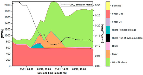 Figure 8 further describes, for the 1st of January, the emission profile of the electrical mix associated to the electricity grid. The emission profile, expressed in ton CO2,eq/MWh, represents for each time step the quantity of CO2,eq emissions produced per MWh of electricity produced in that hour from the electricity mix and present in the electricity grid (Equation (4)).