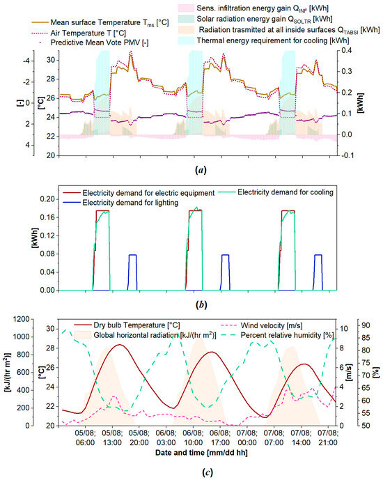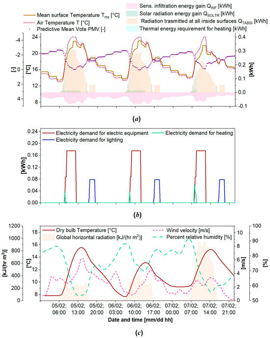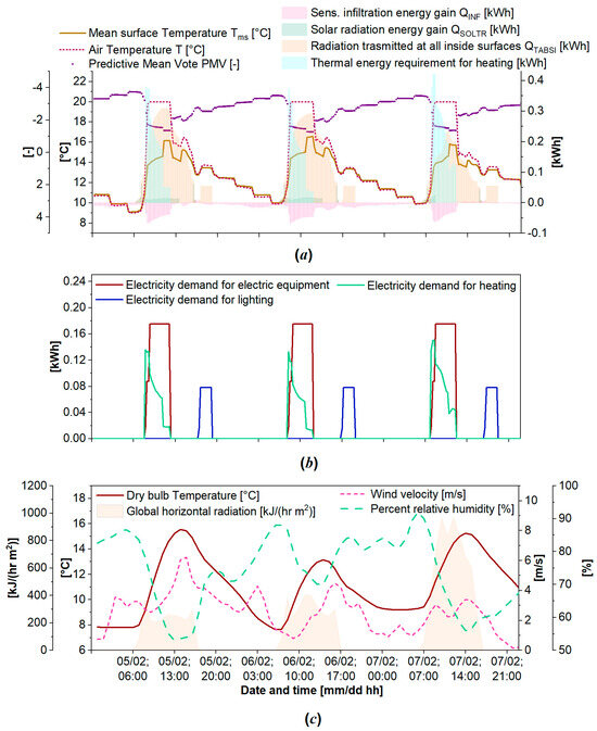 Multizone building modeling with Type 56 and TRNBUILD is used in order to model the energy and thermophysical model of buildings. The building description is transferred to the model by the building description file (*.b18,*.b17, *.bui). The main inputs of Type 56 are the climatic variables and the use and occupation profiles of the thermal zones. Occupancy differences on a hourly–daily (differences between holidays and workdays) and monthly (due to the variable activity of the city) basis were modeled in TRNSYS Simulation Studio, through specific occupation and use profiles. Climatic conditions are modeled using an EPW file (EnergyPlus Weather File) containing the historical climatic data, used as input by Type 15. Type 15 reads and interpolates the climatic data, calculating additional variables (e.g., the effective sky temperature).
