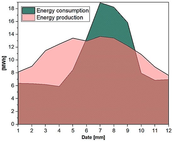 - The PED energy balance is calculated, according to Equation (1), as the difference between the sum of the energy generated by the local RES systems in each time step () and the total energy demand of the district () over a period of one year;