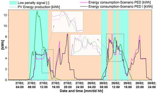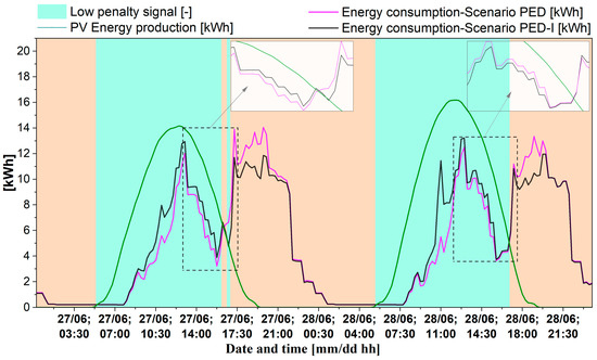 In this study, high penalty periods are defined as those periods of time in which there is a deficit in energy production of the on-site photovoltaic system compared to the electricity demand of the district. On the contrary, the periods of time with a surplus of local energy production constitute the periods of low penalty.