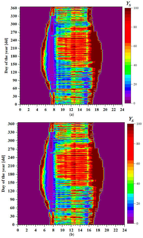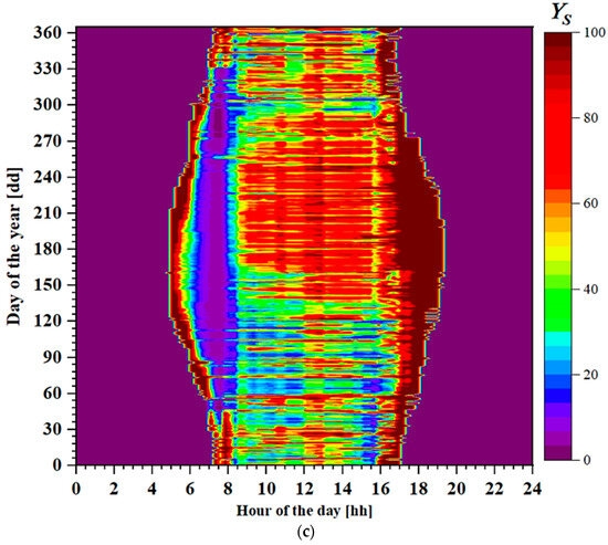 The operating energy costs are calculated according to Equation (5) as the product of the amount of energy imported during each hour of the year, in [kWh], by the specific electricity cost in that hour () in [€/kWh], integrated over the period of one year.