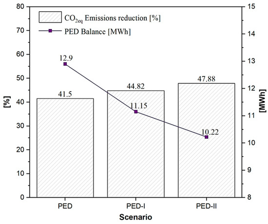 For the evaluation of the environmental impact of the district’s use phase, as in [11], the CO2,eq emissions associated with the import of electricity are calculated. To do this, the emission conversion factors, cel, for each type of energy source, expressed in [CO2,eq/kWh] and defined in [56,57], are used.