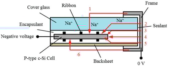 Ionic migration is one of the mechanisms associated with PID in PV modules. In certain conditions, particularly when subjected to high voltage and high temperature, the migration of sodium ions (Na+) through the front glass and encapsulant of conventional crystalline silicon PV modules can contribute to PID, as shown in Figure 2. Sodium ions are naturally present in many materials used in PV module construction, such as glass and encapsulant materials. Under normal operating conditions, these ions remain relatively immobile [20]. However, when the module is exposed to elevated voltages, Na+ ions can drift through the module structure due to the presence of an electric field. This drift is accelerated by the high-temperature conditions often encountered in PV systems. Leakage currents can flow from the module frame to the solar cells along several different pathways: (1) along the surface of the front glass, and through the bulk of front glass and the encapsulant; (2) through the bulk of front glass (laterally) and through the bulk of the encapsulant; (3) along the interface between the front glass and the encapsulant, and through the bulk of the encapsulant; (4) through the bulk of the encapsulant; (5) along the interface between the encapsulant and the backsheet, and through the bulk of the encapsulant; and (6) along the surface of the backsheet, and through the bulk of the backsheet and encapsulant.
