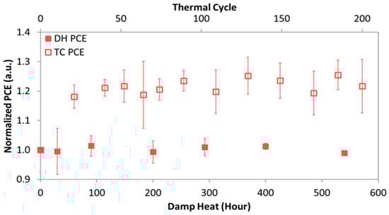 In a recent study [24], metal halide perovskite solar cells (PSCs) were subjected to rapid thermal and damp heating tests to assess their stability under different conditions. The results, shown in Figure 3, indicate that under all thermal cycles (ranging from 0 to 200) and under damp heat (ranging from 0 to 600 h), the normalized power conversion efficiency (PCE) remained stable at around 1 to 1.2, representing significant progress in the verification of PSC technology.