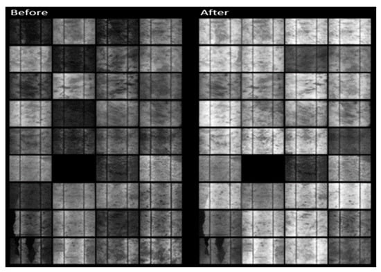 A direct current (DC) voltage is applied to the PV module to simulate conditions that could lead to PID by stressing the module. To conduct a DC bias test, the PV module is typically connected to a DC power source, with the front and back electrodes of the module being connected to the power source in opposite polarity [25]. A DC voltage is then applied to the module, typically at a level that is higher than the maximum voltage that the module is expected to encounter under normal operating conditions. The DC bias test is typically conducted for a set duration of time, often several days or more, to ensure that the module has been subjected to sufficient stress. A recent study [26] examined the impact of a direct current bias test on the performance of PID modules. As shown in Figure 4, the authors demonstrated that when a direct current bias was applied to a PID-affected module for 10 days, the EL showed improved light emissions, indicating an improvement in the performance of the solar cells. Overall, the DC bias test is a useful method for testing for PID in PV modules and for identifying any issues or defects that may be contributing to PID. It can be used in combination with other testing methods to provide a more complete understanding of the performance and reliability of PV modules.
