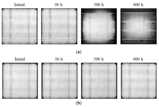 EL images of mini-PV modules before and after 1000 h of PID test at 85 °C/85% RH/−1000 V [43]. (a) G/G, and (b) G/G with edge sealant.