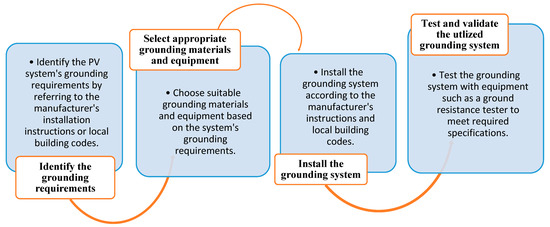 Another way to prevent and mitigate PID is to use proper grounding techniques that are important in the installation of PV modules to ensure the safety of the system and minimize the risk of PID. Proper grounding techniques involve properly grounding the PV module and other components of the PV system to ensure that they are connected to the earth and are at the same electrical potential as the earth. There are several steps involved in using proper grounding techniques when installing a PV system, and these are presented in Figure 7, including key steps: identify the grounding requirement for the PV system, select appropriate grounding materials and equipment, install the grounding system, and finally test and validate the utilized grounding system.