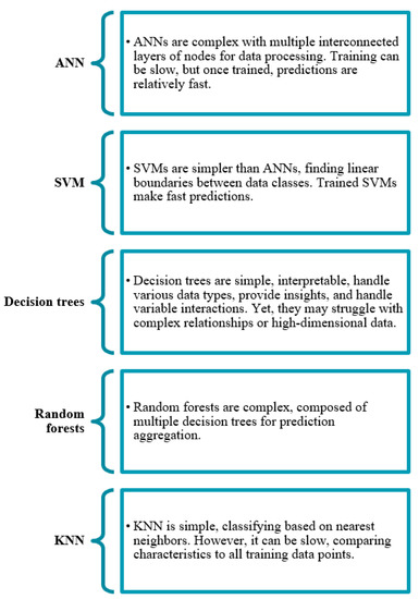 K-nearest neighbors (KNNs) classify data points based on the characteristics of their nearest neighbors. It is easy to implement and understand [59,60,61] and can handle high-dimensional data. However, it can be computationally intensive to find the K nearest neighbors for each data point [62].