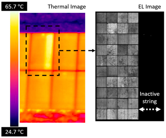 Electroluminescence (EL) imaging is a technique that is used to evaluate the performance of photovoltaic (PV) modules by measuring the light emission that occurs when an electrical current is applied to the module [15]. EL imaging is typically used to identify defects or issues in PV modules that may be affecting their performance, such as cracks, damaged electrodes, or other issues [16]. This information can be used to identify and address any issues that may be contributing to the durability and reliability issues of the PV modules.