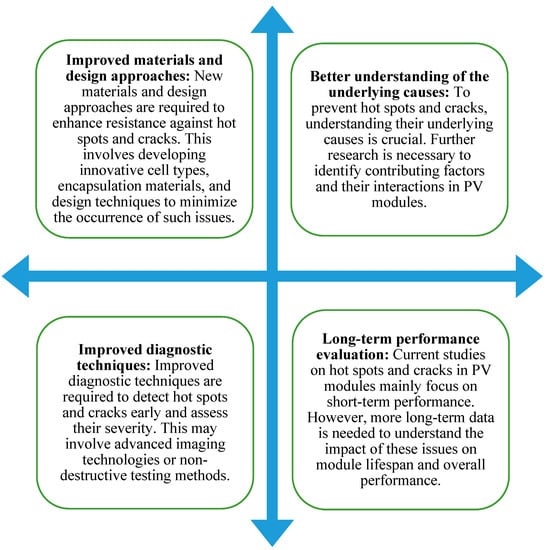 There are several approaches that can be taken to mitigate hot spots in PV modules, including (i) design for proper ventilation: ensuring that there is sufficient airflow around the PV module can help to dissipate heat and reduce the likelihood of hot spots [67], (ii) use materials with high thermal conductivity: materials with high thermal conductivity, such as aluminum [68], can help to dissipate heat more effectively and reduce the likelihood of hot spots, (iii) use solar cells with low thermal resistance: solar cells with low thermal resistance will be less prone to hot spots because they are better able to dissipate heat, (iv) install shading devices: installing shading devices, such as louvers or reflective panels, can help to reduce the amount of direct sunlight that reaches the PV module and reduce the risk of hot spots [69,70], and (v) implement active cooling systems: in some cases, it may be necessary to use active cooling systems, such as fans or water cooling [71], to dissipate heat and prevent hot spots.