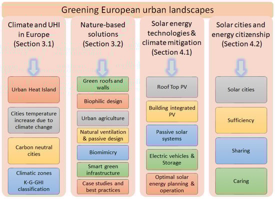 The analytical approach employed in this study (Figure 1) begins with an examination of climate change and urban heat island impact (Section 3.1) and key NBS and their impact on building energy performance and microclimate regulation (Section 3.2). Subsequently, the study reviews the influence of emerging solar energy technologies, such as rooftop PV (RTPV) and building-integrated PV (BIPV), on decarbonizing the building sector, considering their effects on the built microclimate environment (Section 4.1). The intermittent nature of solar energy is comprehensively considered through the application of dedicated artificial storage and indirectly through electric vehicle units. Additionally, the concepts of solar cities and energy citizens are analysed (Section 4.2), while research gaps and requirements for optimal eco-design and urban planning are discussed, emphasizing the synergy of natural, technical, and social aspects (Section 5). The study primarily focuses on the European climatic conditions, categorized using the extended Koppen-Geiger-Global Horizontal Irradiation classification scheme proposed by Skandalos et al. in 2022 [15].