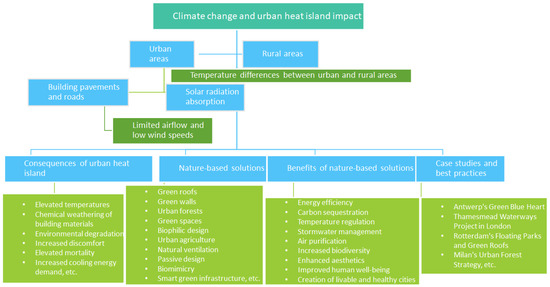 Climate change and UHI impacts are becoming increasingly severe due to rapid urbanization and global warming. The UHI effect causes elevated temperatures in cities compared to surrounding rural areas, leading to various consequences such as environmental degradation, increased discomfort, and higher demand for cooling energy. To address these challenges, NBS are being adopted in the built environment. NBS includes initiatives such as green roofs, urban forests, green walls, and smart green infrastructure, which can mitigate the UHI effect, improve energy efficiency, regulate temperature, manage stormwater, enhance biodiversity, and create more liveable and healthy cities. Various case studies and best practices from European cities have demonstrated the effectiveness of NBS in reducing surface temperatures, decreasing energy consumption, and promoting climate-neutral urban environments (Figure 2).
