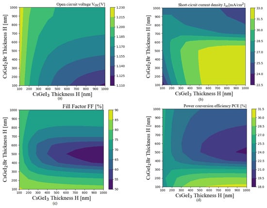 In contrast, when the thickness of the CsGeI2Br is less than , decreases while, , , increase with the thickness of the CsGeI3, as in Figure 2. Indeed, few photons are absorbed by layer CsGeI3 because of their small thickness size. This implies that the absorption of photons can be improved when the thickness of the CsGeI3 layer is large, as shown in Figure 2d. The photons can easily reach the CsGeI3 layer and contribute to the carrier’s photo-generation in this layer. This means that the amount of carrier contributing to the voltage decreases into the benefit of current as shown in Figure 2a,b because the minority carriers photo-generated are kicked out of the solar cell. This observation shows that the carriers have enough energy to leave the valence band to the conduction band and can easily be collected. Therefore, within the implementation of this prototype of PSC, the CsGeI3 layer should be thicker than the CsGeI2Br layer. In literature, the maximum efficiency of a PSC is around 33% [40,41]. This high efficiency, as shown in Figure 2d, is also due to considering the series and shunt resistance beyond the physically acceptable zone during the simulation. In addition, the limit of short circuit and open circuit voltage with respect to the band gap shows that the maximum current and voltage that can be delivered by the CsGeI3 layer are and respectively, while the CsGeI2Br layer is and [40,41]. Thus, depending on the combination of the thicknesses of the different absorber layers, the CsGeI2Br layer can operate beyond its limits and can cause significant heating of the PSC and induce damage. Therefore, as shown in Figure 2a,b,d, the contour plots in yellow must be avoided to maintain the stability of the solar cell.