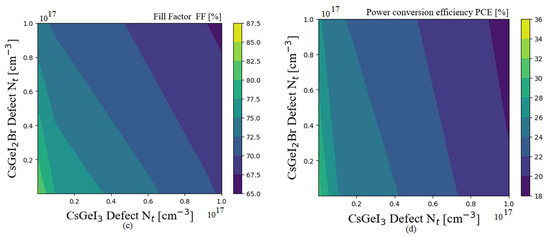 We reveal that the defect density of the two absorber layers affects significantly the electrical parameters, as shown in Figure 4. In fact, when the defect density increases, all the electrical parameters of this PSC decrease. The defect density is modeling the trap of carrier in a solar cell. This trap captures the carrier and favours the recombination process. Otherwise, the defect in the solar cell facilitates the collision between the carriers. This collision induces the losses of energy of the carriers during their journey in the crystal structure. Thus, they can be easily recombined due to their low energy. However, when the quantity of the trap increases, the number of carriers captured increases the recombination process and therefore, the output performance of the PSC decreases, as shown in Figure 4. This high recombination process can cause the device to heat up quickly and damage it. From the limit acceptable in terms of the current and voltage delivered by the CsGeI3 layer and CsGeI2Br layer [40,41], the defect density acceptable should be minimized as much as possible and is considered to be around to avoid the yellow areas, as shown in Figure 4a,b,d.