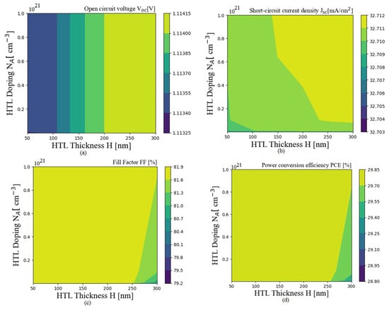 Contribution of doping and thickness of the HTL on the electrical quantities with the system parameters: , , , , , . (a) open circuit voltage , (b) short circuit current , (c) fill factor FF, and (d) power conversion efficiency PCE.