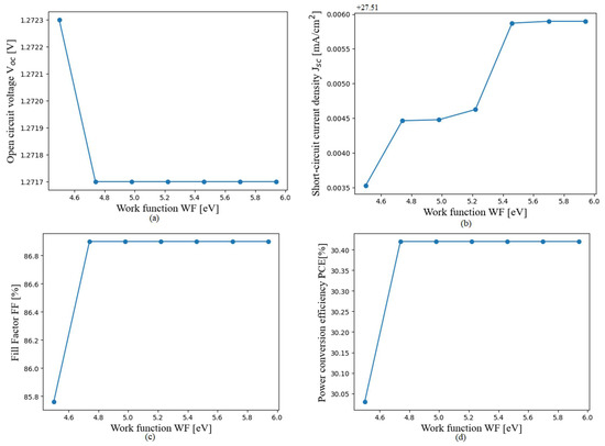 Impact of work function on the electrical quantities with the system parameters: , , , . (a) open circuit voltage , (b) short circuit current , (c) fill factor FF, and (d) power conversion efficiency PCE.