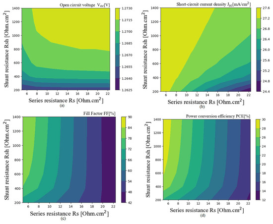 Effect of the series and shunt resistance on the electrical quantities with the system parameters: , , , , , . (a) open circuit voltage , (b) short circuit current , (c) fill factor FF, and (d) power conversion efficiency PCE.