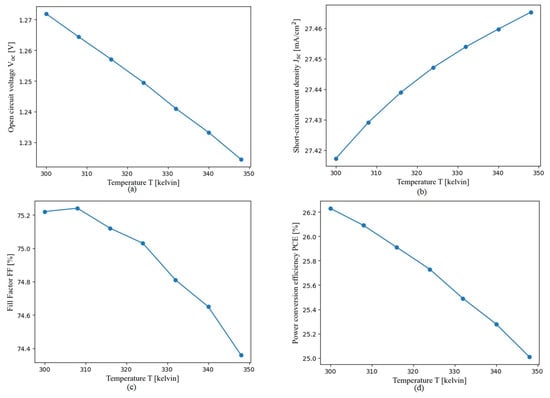 Impact of the temperature on the electrical quantities with the system parameters: , , , . (a) open circuit voltage , (b) short circuit current , (c) fill factor FF, and (d) power conversion efficiency PCE.
