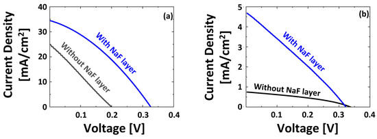 Illuminated current density–voltage (J-V) characteristics of (a) an RFMS-grown Sb2Se3 solar cell with and without NaF interlayer; (b) a PED-grown Cu:Sb2Se3 solar cell with and without NaF interlayer.