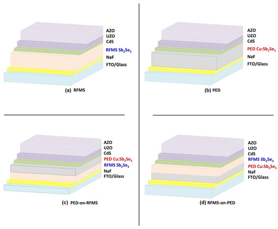 Table 1 contains a list of all the samples (A-series) in which the first layer is deposited with RFMS, followed by the PED film (PED-on-RFMS) (Figure 3c). Sample A1 corresponds to a single thick sputtered Sb2Se3 layer (Figure 3a). Table 2 lists all samples (B-series) in which the first layer is deposited with PED, followed by a sputtered layer (RFMS-on-PED) (Figure 3d). Sample B1 corresponds to a single thick layer deposited via PED (Figure 3b). The A samples have the following structure: AZO/UZO/CdS/Cu:Sb2Se3(PED)/Sb2Se3 (RFMS)/NaF/FTO/glass, while the B-series are fabricated with the inverse sequence of Cu:Sb2Se3 grown first via PED on NaF/FTO, followed by a sputtered Sb2Se3 layer (AZO/UZO/CdS/Sb2Se3(RFMS)/Cu:Sb2Se3 (PED)/NaF/FTO/glass).