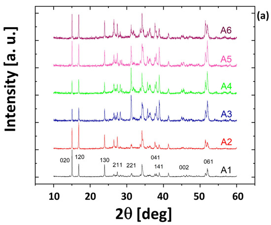 where I0 (hkℓ) is the relative intensity of the reflection with (hkℓ) Miller indices reported in the JCPDS card, and I (hkℓ) is the net intensity measured by the experimental XRD patterns after the background subtraction. A good crystalline quality can be observed for all the films, as testified by the low full-width half-maximum values of the reflections. In most of the cases, the (hk0) are the preferred crystal orientations, with the ribbons lying on the surface, already seen for this kind of growth [32]. However, (hkℓ) orientations with ℓ ≠ 0, especially the (041), (061) and (141) ones, are more intense or comparable to the (hk0) peaks in some bilayers such as in the A3, A4, A5 and B3 samples. In general, the (041), (061) and (141) reflections become predominant when the sputtered layer is thicker.