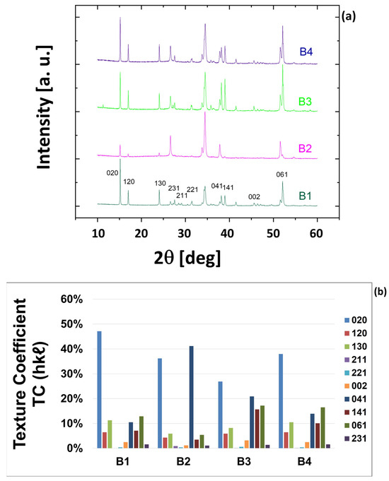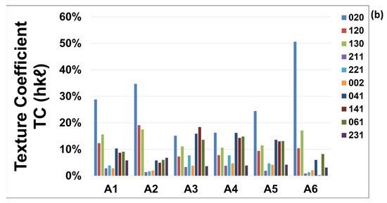 Figure 4b presents the TC values for the principal crystal orientations of the A-series samples. Similarly, Figure 5b depicts the TC values for the B-series samples. Based on its definition in Equation (1), when the texture coefficient (TC) exceeds 10%, a preferred orientation of grains in Sb2Se3 films along one or more of the 10 detected crystallographic directions is observed. Table 3 presents the values of ΣTC(ℓ ≠ 0), representing the sum of all TC values for hkl reflections with ℓ ≠ 0 for each sample analyzed in this study.