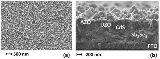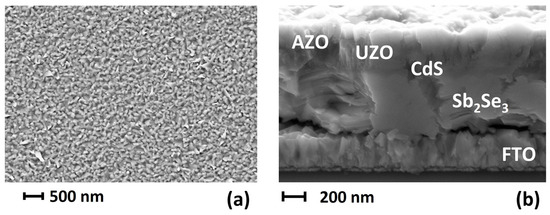 (a) SEM micrograph of the Sb2Se3 surface of a PED-on-RFMS bilayer Sb2Se3 solar cell and (b) the corresponding cross-sectional image.