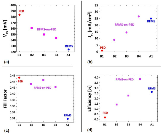 Photovoltaic performances—(a) Voc, (b) Jsc, (c) FF, and (d) Efficiency - of the different B-series solar cells (purple squares). The completely PED-grown Sb2Se3 solar cell (red diamond), B1, and the completely sputtered Sb2Se3 solar cell (blue circle), A1, are used for benchmarking.