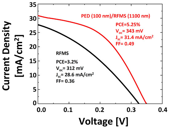 The current density–voltage (J-V curve) of the best Sb2Se3 cells obtained entirely via sputtering (Sample A1, black curve) and the bilayered RFMS-on-PED B4 structure (red curve).