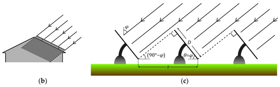 (a) Changing the angle at which the roof of a house is inclined to the horizontal affects the amount of sunlight any solar panels are able to collect due to the cross-sectional area of the roof changing, as seen by incident sunlight. When this angle of incline is equal to the latitude , the sunlight is normally incident, and the insolation is maximised. This assumes no azimuthal offset, as any such offset will mean the insolation received will be maximised for an angle . (b) While the angle of a roof to the horizontal does affect the amount of sunlight that can be collected, it does not influence the necessary spacing between rows, as the panels are generally laid flat on the roof in a single row, and any shadows cast (indicated by the shaded area in this diagram) have no effect on the performance of the array. (c) In the case of a solar farm, the latitude and the angle to the horizontal both influence the distance required between successive rows of solar panels. In this situation, the azimuthal angle can be set to zero during construction. Here, we set in order to maximise the insolation received by each panel, thus minimising the amount of solar panel material needed.