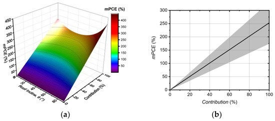 We repeated the calculations above, first constraining the contribution and then determining the corresponding mPCEs that would be required to achieve them. The results for the average home are shown in Figure 4a as a function of both the roof pitch and contribution. Figure 4b shows a cross-section of this at a fixed roof pitch of 39°, the angle corresponding to the lowest mPCEs. The shaded region in Figure 4b shows the uncertainty.