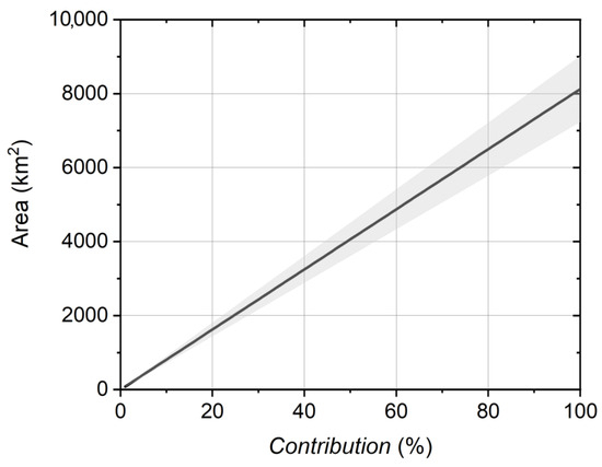 An alternative to roof-mounted solar arrays is to construct a number of large-scale solar farms. Here, we calculate the land area that would have to be dedicated to a solar farm as a function of contribution using solar panels of PCENOW. In this calculation, we supposed that the panels, if tilted, were built facing meridionally south (). We therefore used the obliquity factor from Equation (3) in Section 2.4.1. The results are shown in Figure 5, where the shaded area represents an estimate of uncertainty, the main source of which in this case is the energy consumption data.